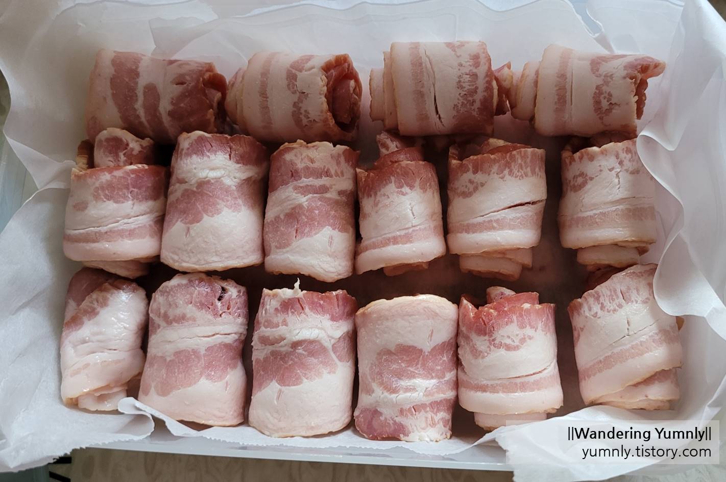 베이컨을 한 장씩 돌돌 말아줍니다. 단단하게 말면 작은 부피로 풀리지 않게 보관할 수 있어요.