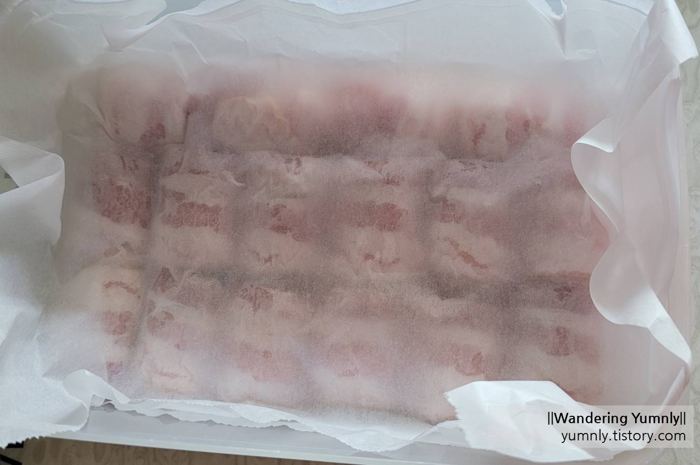 한 칸이 끝나면 다시 종이호일을 깔고 베이컨을 올립니다. 수분이 많은 고기는 종이호일을 한 장만 깔았을 때, 위 아래의 고기가 달라붙게 되는데요. 베이컨은 한장만 깔아도 괜찮더라구요.